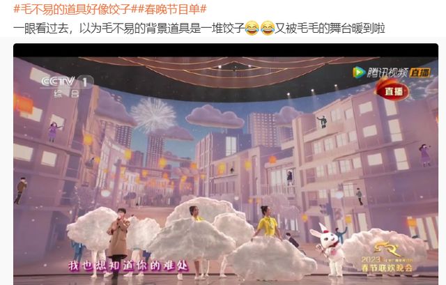 毛不易在春晚演唱歌曲《你好陌生人》,观众发现舞台上的云朵道具好像饺子。这么想的观众朋友是饿了吗?不过还是有被毛不易的歌曲温暖到啦。